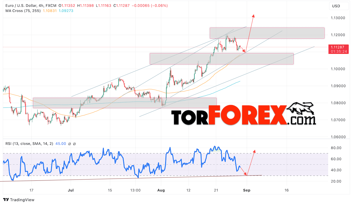 Валютная пара Евро Доллар продолжает движение в рамках развития коррекции и бычьего канала. Скользящие средние указывают на наличие краткосрочной восходящей тенденции по паре EUR/USD. В момент подготовки прогноза цены тестируют область между сигнальными, что указывает на давление со стороны покупателей европейской валюты и потенциальное продолжение роста котировок доллара США с текущих уровней. В рамках Форекс прогноза на 30 августа 2024 стоит ожидать попытку развития падения цены и тест уровня поддержки, который располагается на паре EUR/USD вблизи отметки 1.1105. Далее, отскок цен вверх и продолжение роста валютной пары Евро Доллар. Потенциальной целью такого движения на FOREX выступает область выше отметки 1.1325.