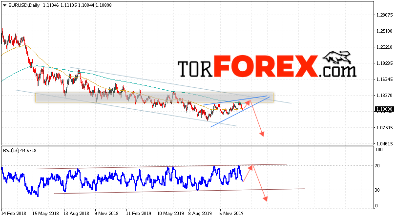 В пользу падения валютной пары EUR/USD на Форекс выступит тест нисходящей линии тренда на индикаторе относительной силы. Вторым сигналом станет отскок от верхней границы нисходящего канала. Отменой варианта падения котировок пары Евро Доллар на текущей торговой неделе 13 — 17 января 2020, станет сильный рост и пробой уровня 1.1445. Это укажет на пробой области сопротивления и продолжения роста пары в область выше уровня 1.1785. С пробоем области поддержки и закрытием котировок ниже уровня 1.0985 стоит ожидать подтверждения развития нисходящего движения по паре и начало отработки модели «Клин».