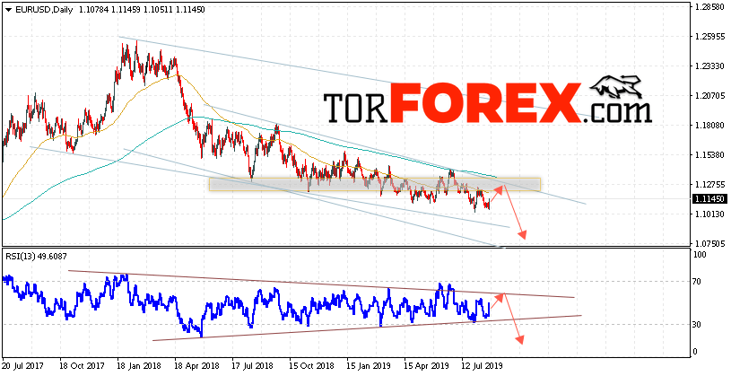 Таким образом, EUR/USD прогноз Евро Доллар на неделю 26 — 30 августа 2019 предполагает попытку теста области сопротивления вблизи уровня 1.1275. Откуда стоит ожидать продолжения падения пары в область ниже уровня 1.0745. В пользу падения выступит тест линии тренда на индикаторе относительной силы. Отменой варианта снижения евро доллар станет сильный рост и пробой уровня 1.1375. В этом случае стоит ожидать продолжения роста пары с потенциальной целью на уровне 1.1755.
