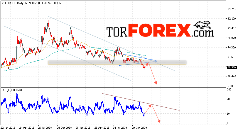 Таким образом, Прогноз Евро к Рублю на 30 декабря 2019 — 3 января 2020 предполагает попытку теста уровня сопротивления вблизи области 69.65. Откуда стоит ожидать отскок и продолжения падения курса Евро против Рубля с целью ниже уровня 64.75. Дополнительным сигналом в пользу падения пары выступит тест линии тренда на индикаторе относительной силы. Отменой варианта снижения станет пробой верхней границы нисходящего канала и закрытие котировок над уровнем 72.05. Это укажет на продолжение роста к уровню 75.65.
