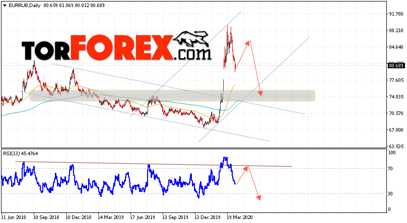 Дополнительным сигналом в пользу снижения валютной пары EUR/RUB выступит тест верхней границы восходящего канала. Вторым сигналом станет отскок от линии тренда на индикаторе относительной силы. Отменой варианта падения пары EUR/RUB на текущей торговой неделе 13 — 17 апреля 2020 станет сильный рост и пробой уровня 92.05 Евро за Рубль. Это укажет на пробой верхней границы канала и ускорение роста пары Евро Рубль в область выше уровня 99.65. Подтверждением падения пары на текущей торговой неделе выступит пробой уровня поддержки и закрытие ниже уровня 79.05.
