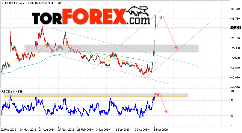 Дополнительным сигналом в пользу падения валютной пары EUR/RUB выступит тест верхней границы восходящего канала. Вторым сигналом станет отскок от области сопротивления на индикаторе относительной силы. Отменой варианта падения пары EUR/RUB на текущей торговой неделе 16 — 20 марта 2020 станет сильный рост и пробой уровня 87.05 Евро за Рубль. Это укажет на пробой верхней границы канала и ускорение роста пары Евро Рубль в область выше уровня 95.05. Подтверждением падения пары на текущей торговой неделе выступит пробой уровня поддержки и закрытие ниже уровня 78.55.