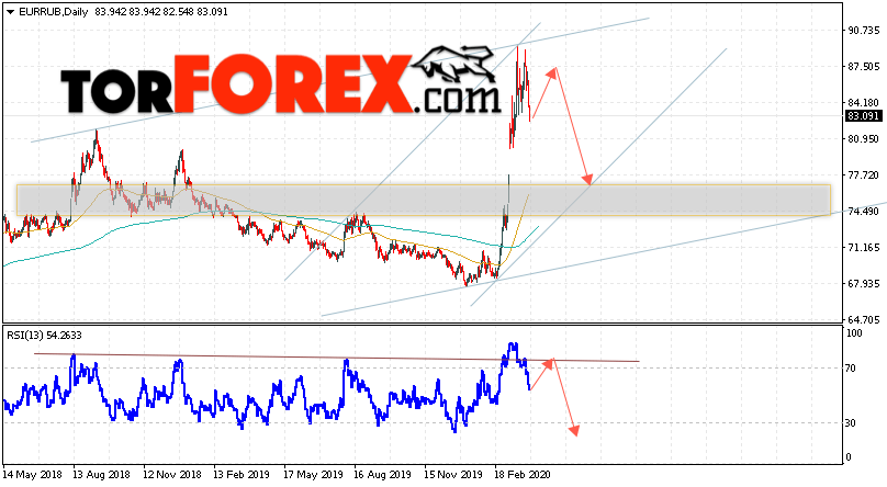 Дополнительным сигналом в пользу снижения валютной пары EUR/RUB выступит тест верхней границы восходящего канала. Вторым сигналом станет отскок от лини тренда на индикаторе относительной силы. Отменой варианта падения пары EUR/RUB на текущей торговой неделе 6 — 10 апреля 2020 станет сильный рост и пробой уровня 92.05 Евро за Рубль. Это укажет на пробой верхней границы канала и ускорение роста пары Евро Рубль в область выше уровня 99.65. Подтверждением падения пары на текущей торговой неделе выступит пробой уровня поддержки и закрытие ниже уровня 79.05.