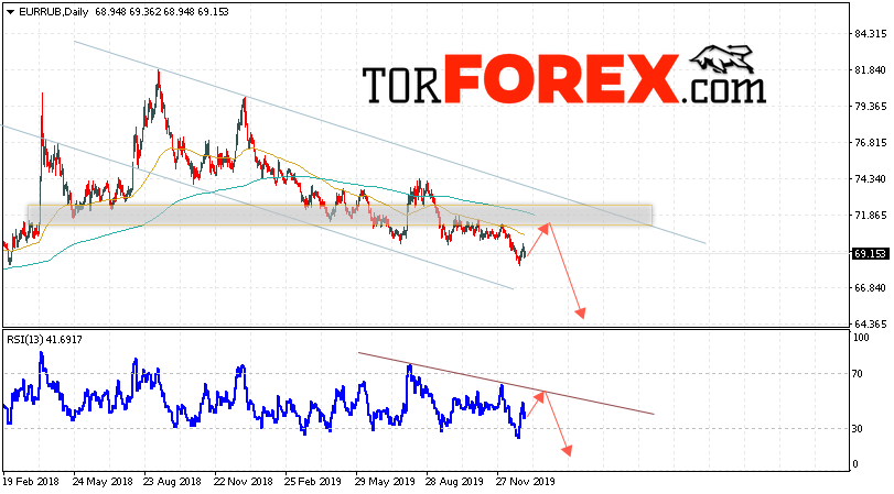 В пользу снижения валютной пары EUR/RUB выступит тест верхней границы нисходящего канала. Вторым сигналом станет отскок от нисходящей линии сопротивления на индикаторе относительной силы. Отменой варианта падения пары EUR/RUB на текущей торговой неделе 6 — 10 января 2020 станет сильный рост и пробой уровня 72.35 Евро за Рубль. Это укажет на пробой верхней границы нисходящего канала и ускорение роста пары Евро Рубль в область выше уровня 75.95. Подтверждением падения пары на текущей торговой неделе выступит пробой уровня поддержки и закрытие ниже уровня 67.55.