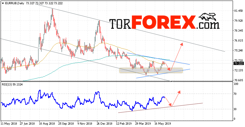 В пользу подъёма валютной пары EUR/RUB выступит тест нижней границы модели «Треугольник». Вторым сигналом станет отскок от восходящей линии поддержки на индикаторе относительной силы (RSI). Отменой варианта роста пары EUR/RUB на текущей торговой неделе 10 — 14 июня 2019 станет падение и пробой уровня 70.65 Евро за Рубль. Это укажет на нижней границы канала и ускорение снижения пары Евро Рубль в область ниже уровня 66.55. Подтверждением роста пары на текущей торговой неделе выступит пробой области сопротивления и закрытие выше уровня 74.05.