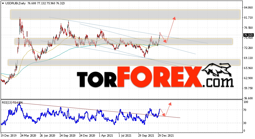 Валютная пара Доллар Рубль USD/RUB завершает торговую неделю вблизи уровня 76.32 Рублей за Доллар США. Пара продолжает движение в рамках роста и покинула пределы медвежьего канала. Скользящие средние указывают на наличие нисходящей тенденции. Цены пробили область между сигнальными линиями вверх, что указывает на давление со стороны покупателей доллара США и вероятное продолжение роста пары уже с этих уровней. На текущей торговой неделе 10 — 14 января 2022 стоит ожидать попытку развития коррекции и тест области поддержки вблизи уровня 72.55. Откуда стоит ожидать отскок вверх и продолжение роста курса Доллара к Российскому Рублю выше уровня 81.45.