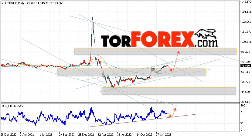 Валютная пара Доллар Рубль USD/RUB завершает торговую неделю вблизи уровня 73.86 Рублей за Доллар США. Пара продолжает движение в рамках роста и бычьего канала. Скользящие средние указывают на наличие бычьей тенденции. Цены пробили область между сигнальными линиями вверх, что указывает на давление со стороны покупателей доллара США и вероятное продолжение роста пары уже с этих уровней. На текущей торговой неделе 13 — 17 марта 2023 стоит ожидать попытку развития снижения и тест области поддержки вблизи уровня 68.65. Откуда стоит ожидать отскок вверх и продолжение роста курса Доллара к Российскому Рублю с целью выше уровня 89.25.