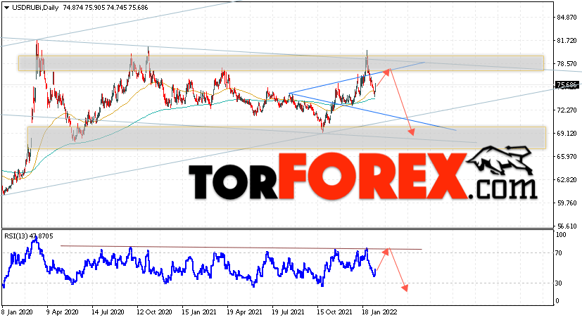 Валютная пара Доллар Рубль USD/RUB завершает торговую неделю вблизи уровня 75.68 Рублей за Доллар США. Пара продолжает движение в рамках коррекции и начала отработки модели ”Волна Вульфа”. Скользящие средние указывают на наличие бычьей тенденции. Цены пробили область между сигнальными линиями вверх, что указывает на давление со стороны покупателей доллара США и вероятное продолжение роста пары уже с этих уровней. На текущей торговой неделе 14 — 18 февраля 2022 стоит ожидать попытку развития подъёма и тест области сопротивления вблизи уровня 78.25. Откуда стоит ожидать отскок вниз и продолжение падения курса Доллара к Российскому Рублю ниже уровня 69.05.