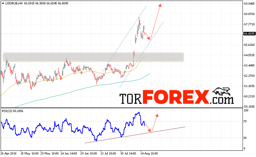 В пользу роста пары USD/RUB выступит тест линии тренда на индикаторе относительной силы. Отменой варианта роста пары USD/RUB на Форекс станет падение и пробой уровня 65.20 Рублей за Доллар, что укажет на пробой нижней границы восходящего канала и продолжение падения пары Доллар Рубль в область ниже уровня 64.00. Подтверждением роста пары выступит пробой области сопротивления и закрытие выше уровня 67.80.