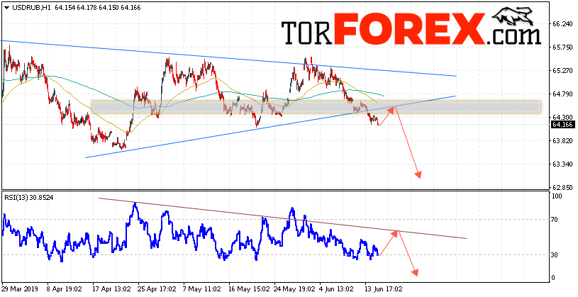 В пользу снижения пары USD/RUB 18 июня 2019 выступит тест области сопротивления на индикаторе относительной силы. Вторым сигналом станет отскок от нижней границы модели «Треугольник». Отменой варианта снижения пары USD/RUB на Форекс станет сильный рост и пробой уровня 64.95 Рублей за Доллар. Это укажет на пробой области сопротивления и продолжение роста пары Доллар Рубль в область выше уровня 66.55. Подтверждением падения пары выступит пробой области поддержки и закрытие ниже уровня 63.85.