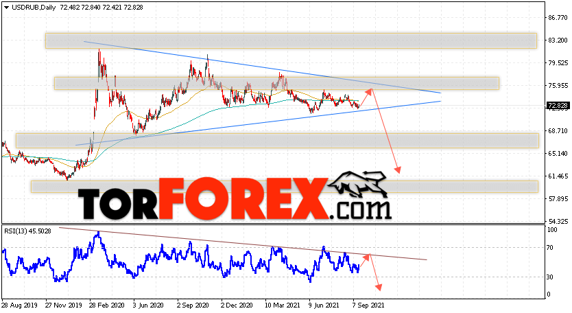 Валютная пара Доллар Рубль USD/RUB завершает торговую неделю вблизи уровня 72.82 Рублей за Доллар США. Пара продолжает движение в рамках коррекции и формирования модели ”Треугольник”, который участники рынка никак не могут пробить в одну из сторон. Скользящие средние указывают на наличие боковой тенденции. Цены пробили область между сигнальными линиями вниз, что указывает на давление со стороны продавцов доллара США и вероятное продолжение падения пары уже с этих уровней. На текущей торговой неделе 20 — 24 сентября 2021 стоит ожидать попытку развития коррекции и тест области сопротивления вблизи уровня 75.25. Откуда стоит ожидать отскок и продолжение падения курса Доллара к Российскому Рублю ниже уровня 61.65.