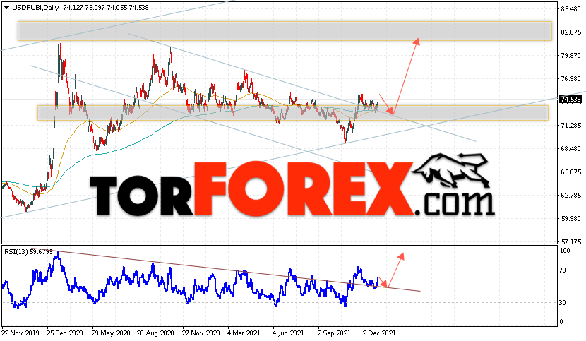 Валютная пара Доллар Рубль USD/RUB завершает торговую неделю вблизи уровня 74.53 Рублей за Доллар США. Пара продолжает движение в рамках роста и покинула пределы медвежьего канала. Скользящие средние указывают на наличие нисходящей тенденции. Цены пробили область между сигнальными линиями вверх, что указывает на давление со стороны покупателей доллара США и вероятное продолжение роста пары уже с этих уровней. На текущей торговой неделе 3 — 7 января 2022 стоит ожидать попытку развития коррекции и тест области поддержки вблизи уровня 71.65. Откуда стоит ожидать отскок вверх и продолжение роста курса Доллара к Российскому Рублю выше уровня 80.05.