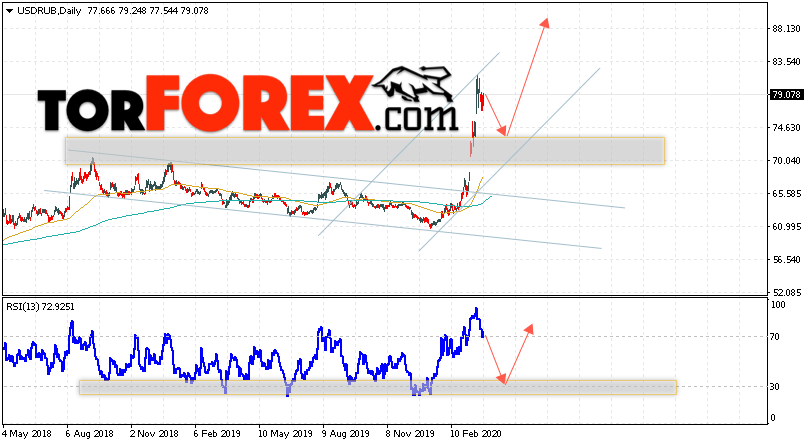 Валютная пара Доллар Рубль USD/RUB завершает торговую неделю вблизи уровня 79.07 Рублей за Доллар США. Пара продолжает движение в рамках сильного роста. Скользящие средние указывают на наличие бычьей тенденции. Цены ушли далеко от области между сигнальными линиями, что указывает а давление со стороны покупателей доллара США. На текущей торговой неделе 30 марта — 3 апреля 2020 стоит ожидать попытку развития коррекции и тест области поддержки вблизи уровня 73.95. Откуда стоит ожидать отскок и продолжение роста курса Доллара выше уровня 90.05.
