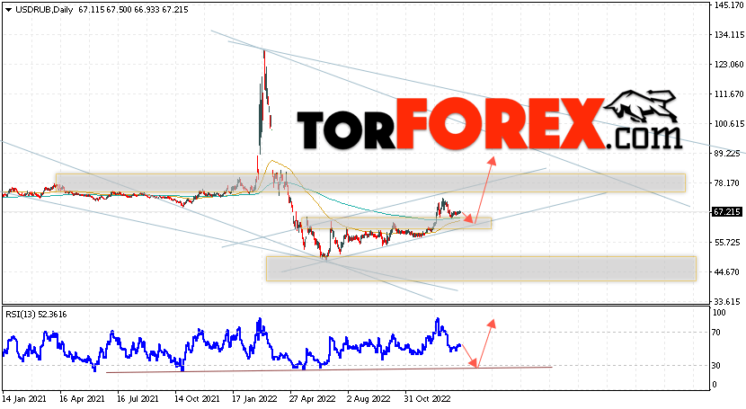 Валютная пара Доллар Рубль USD/RUB завершает торговую неделю вблизи уровня 67.21 Рублей за Доллар США. Пара продолжает движение в рамках коррекции и бычьего канала. Скользящие средние указывают на наличие медвежьей тенденции. Цены пробили область между сигнальными линиями вверх, что указывает на давление со стороны покупателей доллара США и вероятное продолжение роста пары уже с этих уровней. На текущей торговой неделе 30 января — 3 февраля 2023 стоит ожидать попытку развития снижения и тест области поддержки вблизи уровня 65.45. Откуда стоит ожидать отскок вверх и продолжение роста курса Доллара к Российскому Рублю с целью выше уровня 89.05.
