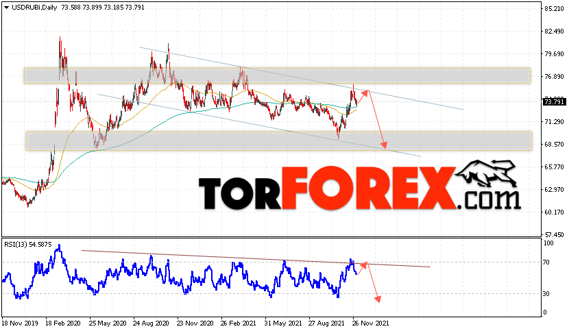 Валютная пара Доллар Рубль USD/RUB завершает торговую неделю вблизи уровня 73.79 Рублей за Доллар США. Пара продолжает движение в рамках подъёма и медвежьего канала. Скользящие средние указывают на наличие нисходящей тенденции. Цены пробили область между сигнальными линиями вверх, что указывает на давление со стороны покупателей доллара США и вероятное продолжение роста пары уже с этих уровней. На текущей торговой неделе 6 — 10 декабря 2021 стоит ожидать попытку развития бычьей коррекции и тест области сопротивления вблизи уровня 74.75. Откуда стоит ожидать отскок вниз и продолжение падения курса Доллара к Российскому Рублю ниже уровня 68.25.
