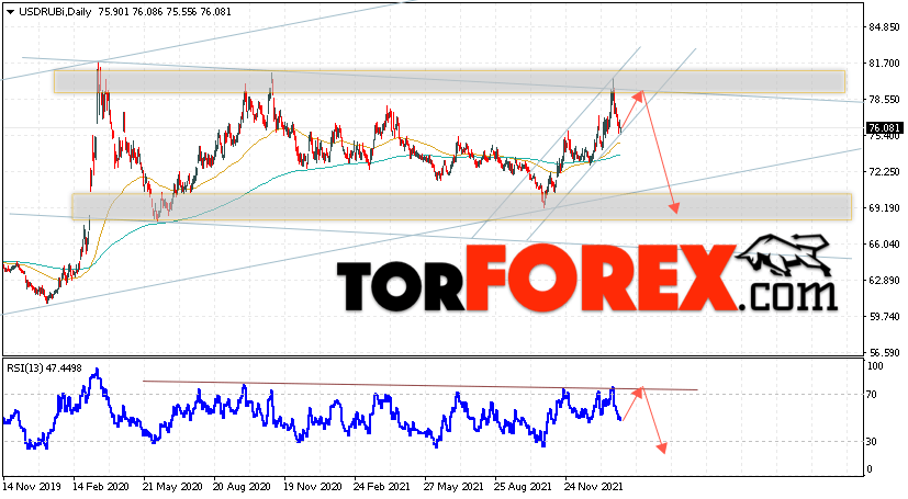Валютная пара Доллар Рубль USD/RUB завершает торговую неделю вблизи уровня 76.08 Рублей за Доллар США. Пара продолжает движение в рамках коррекции. Скользящие средние указывают на наличие бычьей тенденции. Цены пробили область между сигнальными линиями вверх, что указывает на давление со стороны покупателей доллара США и вероятное продолжение роста пары уже с этих уровней. На текущей торговой неделе 7 — 11 февраля 2022 стоит ожидать попытку развития подъёма и тест области сопротивления вблизи уровня 78.45. Откуда стоит ожидать отскок вниз и продолжение падения курса Доллара к Российскому Рублю ниже уровня 69.20.