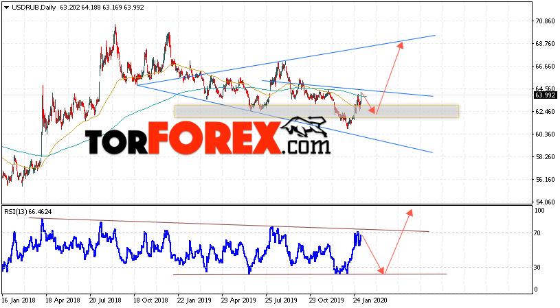 Таким образом, Прогноз курса Доллара на неделю 10 — 14 февраля 2020 предполагает попытку теста области поддержки вблизи уровня 62.45. Откуда стоит ожидать попытку падения Доллара в область выше уровня 68.75. Дополнительным сигналом станет отскок от линии поддержки на индикаторе относительной силы. Отменой варианта роста курса Доллара на текущей торговой неделе станет падение и пробой области 58.35. Что укажет на продолжение снижения пары с целью на уровне 55.65.