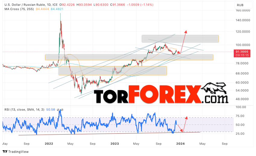 Валютная пара Доллар Рубль USD/RUB завершает торговую неделю вблизи уровня 91.36 Рублей за Доллар США. Пара продолжает движение в рамках роста и бычьего канала. Скользящие средние указывают на наличие восходящей тенденции. Цены вновь тестируют область между сигнальными линиями, что указывает на давление со стороны покупателей доллара США и вероятное продолжение роста пары уже с этих уровней. На текущей торговой неделе 11 — 15 декабря 2023 стоит ожидать попытку развития коррекции и тест области поддержки вблизи уровня 89.65. Откуда стоит ожидать отскок вверх и продолжение роста курса Доллара к Российскому Рублю с целью выше уровня 120.65.