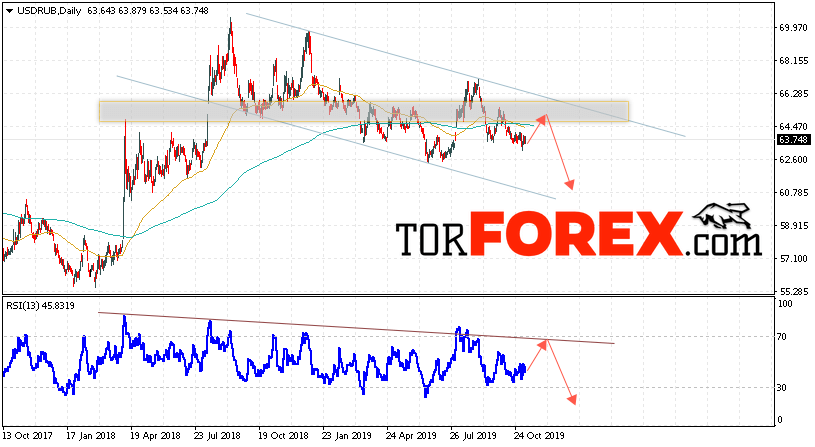 Валютная пара Доллар Рубль USD/RUB завершает торговую неделю вблизи уровня 63.74 Рублей за Доллар США. Пара продолжает движение в рамках коррекции и нисходящего канала. Скользящие средние указывают на наличие нисходящей тенденции. На текущей торговой неделе 11 — 15 ноября 2019 стоит ожидать попытку роста и тест области сопротивления вблизи уровня 64.45. Откуда стоит ожидать отскок и продолжение падения курса Доллара ниже уровня 60.80.