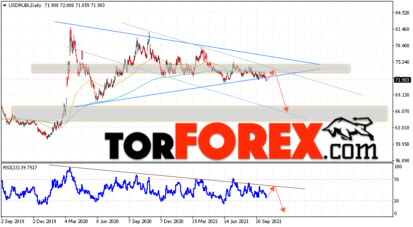 Валютная пара Доллар Рубль USD/RUB завершает торговую неделю вблизи уровня 71.98 Рублей за Доллар США. Пара продолжает движение в рамках коррекции и начала отработки модели ”Треугольник”. Скользящие средние указывают на наличие нисходящей тенденции. Цены пробили область между сигнальными линиями вниз, что указывает на давление со стороны продавцов доллара США и вероятное продолжение падения пары уже с этих уровней. На текущей торговой неделе 11 — 15 октября 2021 стоит ожидать попытку развития коррекции и тест области сопротивления вблизи уровня 72.55. Откуда стоит ожидать отскок и продолжение падения курса Доллара к Российскому Рублю ниже уровня 66.25.