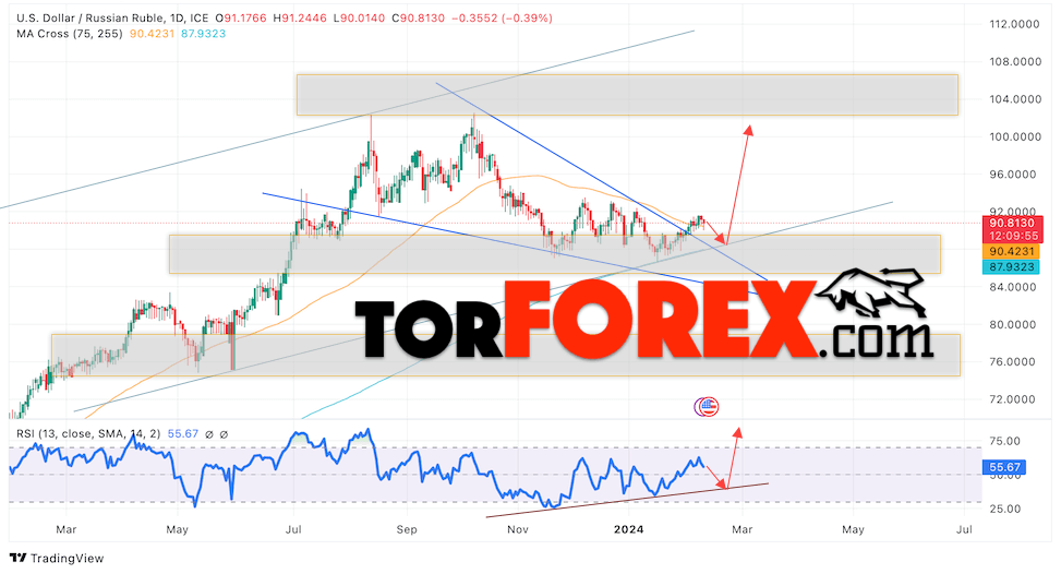 Валютная пара Доллар Рубль USD/RUB завершает торговую неделю вблизи уровня 90.81 Рублей за Доллар США. Пара продолжает движение в рамках роста и завершения формирования разворотной модели «Клин». Скользящие средние указывают на наличие восходящей тенденции. Цены вновь тестируют область между сигнальными линиями, что указывает на давление со стороны покупателей доллара США и вероятное продолжение роста пары уже с этих уровней. На текущей торговой неделе 12 — 16 февраля 2024 стоит ожидать попытку развития коррекции и тест области поддержки вблизи уровня 88.25. Откуда стоит ожидать отскок вверх и продолжение роста курса Доллара к Российскому Рублю с целью выше уровня 100.45.