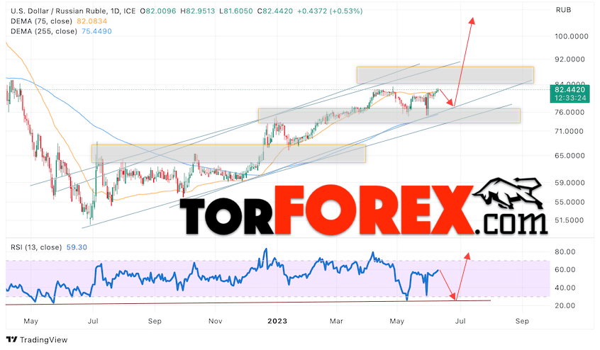 Валютная пара Доллар Рубль USD/RUB завершает торговую неделю вблизи уровня 82.44 Рублей за Доллар США. Пара продолжает движение в рамках роста и бычьего канала. Скользящие средние указывают на наличие бычьей тенденции. Цены вновь тестируют область между сигнальными линиями, что указывает на давление со стороны покупателей доллара США и вероятное продолжение роста пары уже с этих уровней. На текущей торговой неделе 12 — 16 июня 2023 стоит ожидать попытку развития коррекции и тест области поддержки вблизи уровня 77.65. Откуда стоит ожидать отскок вверх и продолжение роста курса Доллара к Российскому Рублю с целью выше уровня 102.55.