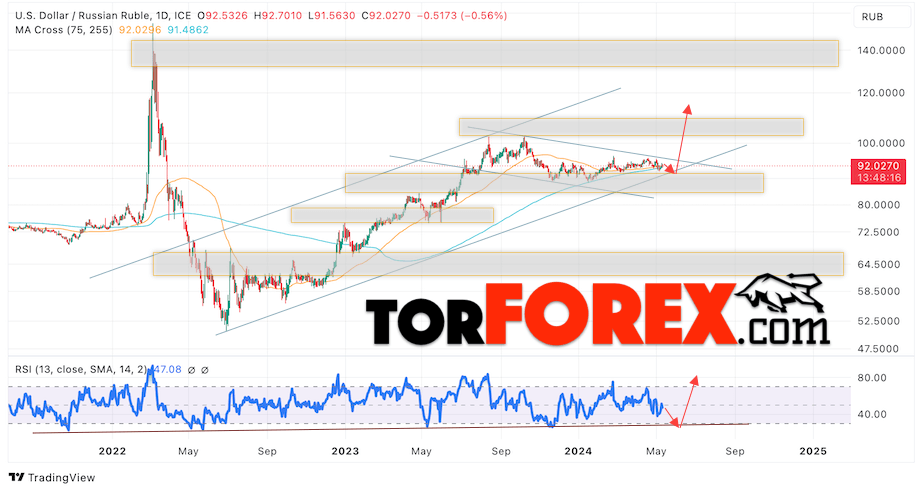 Валютная пара Доллар Рубль USD/RUB завершает торговую неделю вблизи уровня 92.02 Рублей за Доллар США. Пара продолжает движение в рамках коррекции и бычьего канала. Скользящие средние указывают на наличие восходящей тенденции. Цены вновь тестируют область между сигнальными линиями, что указывает на давление со стороны покупателей доллара США и вероятное продолжение роста пары уже с этих уровней. На текущей торговой неделе 13 — 17 мая 2024 стоит ожидать попытку развития коррекции и тест области поддержки вблизи уровня 90.05. Откуда стоит ожидать отскок вверх и продолжение роста курса Доллара к Российскому Рублю с целью выше уровня 115.05.