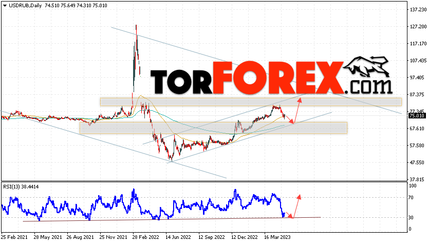 Валютная пара Доллар Рубль USD/RUB завершает торговую неделю вблизи уровня 75.01 Рублей за Доллар США. Пара продолжает движение в рамках нисходящей коррекции и бычьего канала. Скользящие средние указывают на наличие бычьей тенденции. Цены пробили область между сигнальными линиями вверх, что указывает на давление со стороны покупателей доллара США и вероятное продолжение роста пары уже с этих уровней. На текущей торговой неделе 15 — 19 мая 2023 стоит ожидать попытку развития коррекции и тест области поддержки вблизи уровня 70.05. Откуда стоит ожидать отскок вверх и продолжение роста курса Доллара к Российскому Рублю с целью выше уровня 84.55.