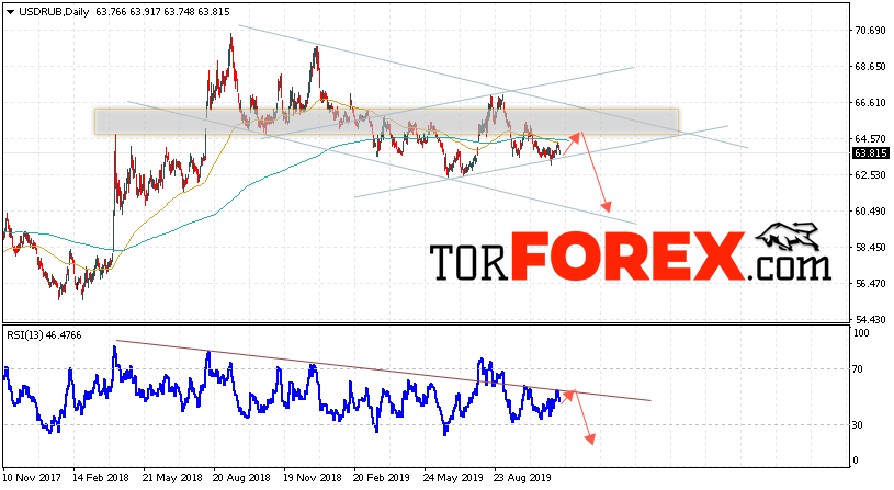 Валютная пара Доллар Рубль USD/RUB завершает торговую неделю вблизи уровня 63.81 Рублей за Доллар США. Пара продолжает движение в рамках коррекции и нисходящего канала. Скользящие средние указывают на наличие нисходящей тенденции. На текущей торговой неделе 18 — 22 ноября 2019 стоит ожидать попытку роста и тест области сопротивления вблизи уровня 64.55. Откуда стоит ожидать отскок и продолжение падения курса Доллара ниже уровня 60.50.