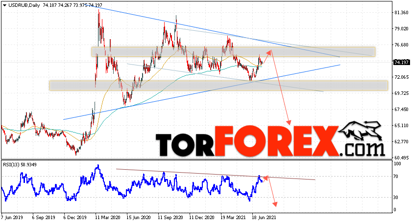 Валютная пара Доллар Рубль USD/RUB завершает торговую неделю вблизи уровня 74.19 Рублей за Доллар США. Пара продолжает движение в рамках коррекции и формирования модели ”Треугольник”. Скользящие средние указывают на наличие бычьей тенденции. Цены пробили область между сигнальными линиями вверх, что указывает на давление со стороны покупателей доллара США. На текущей торговой неделе 19 — 23 июля 2021 стоит ожидать попытку развития коррекции и тест области сопротивления вблизи уровня 75.55. Откуда стоит ожидать отскок и продолжение падения курса Доллара к Российскому Рублю ниже уровня 65.15.