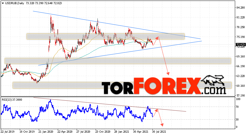 Валютная пара Доллар Рубль USD/RUB завершает торговую неделю вблизи уровня 72.82 Рублей за Доллар США. Пара продолжает движение в рамках коррекции и формирования модели ”Треугольник”. Скользящие средние указывают на наличие бычьей тенденции. Цены пробили область между сигнальными линиями вниз, что указывает на давление со стороны продавцов доллара США. На текущей торговой неделе 2 — 6 августа 2021 стоит ожидать попытку развития коррекции и тест области сопротивления вблизи уровня 75.15. Откуда стоит ожидать отскок и продолжение падения курса Доллара к Российскому Рублю ниже уровня 63.25.