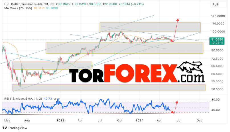 Валютная пара Доллар Рубль USD/RUB завершает торговую неделю вблизи уровня 91.05 Рублей за Доллар США. Пара продолжает движение в рамках коррекции и бычьего канала. Скользящие средние указывают на наличие восходящей тенденции. Цены вновь тестируют область между сигнальными линиями, что указывает на давление со стороны покупателей доллара США и вероятное продолжение роста пары уже с этих уровней. На текущей торговой неделе 20 — 24 мая 2024 стоит ожидать попытку развития коррекции и тест области поддержки вблизи уровня 89.25. Откуда стоит ожидать отскок вверх и продолжение роста курса Доллара к Российскому Рублю с целью выше уровня 112.45.