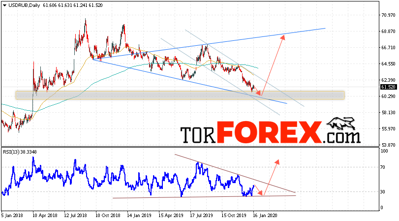 Валютная пара Доллар Рубль USD/RUB завершает торговую неделю вблизи уровня 61.52 Рублей за Доллар США. Пара продолжает движение в рамках снижения и формирования бычьей модели «Волна Вульфа». Скользящие средние указывают на наличие медвежьей тенденции. На текущей торговой неделе 20 — 24 января 2020 стоит ожидать попытку развития падения и тест области поддержки вблизи уровня 60.25. Откуда стоит ожидать отскок и продолжение роста курса Доллара выше уровня 68.75.