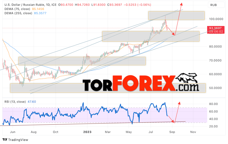 Валютная пара Доллар Рубль USD/RUB завершает торговую неделю вблизи уровня 93.36 Рублей за Доллар США. Пара продолжает движение в рамках коррекции цены и бычьего канала. Скользящие средние указывают на наличие бычьей тенденции. Цены вновь тестируют область между сигнальными линиями, что указывает на давление со стороны покупателей доллара США и вероятное продолжение роста пары уже с этих уровней. На текущей торговой неделе 21 — 25 августа 2023 стоит ожидать попытку развития коррекции и тест области поддержки вблизи уровня 90.05. Откуда стоит ожидать отскок вверх и продолжение роста курса Доллара к Российскому Рублю с целью выше уровня 110.05.