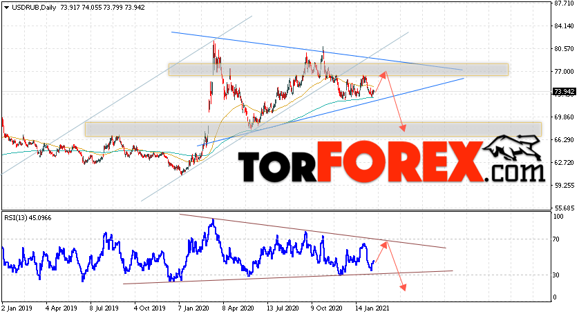 Валютная пара Доллар Рубль USD/RUB завершает торговую неделю вблизи уровня 73.94 Рублей за Доллар США. Пара продолжает движение в рамках коррекции и формирования большой модели ”Треугольник”. Скользящие средние указывают на наличие бычьей тенденции. Цены вновь тестируют от области между сигнальными линиями, что указывает на давление со стороны покупателей доллара США. На текущей торговой неделю 22 — 26 февраля 2021 стоит ожидать попытку развития роста и тест области сопротивления вблизи уровня 74.35. Откуда стоит ожидать отскок и начала падения курса Доллара к Российскому Рублю ниже уровня 66.35.