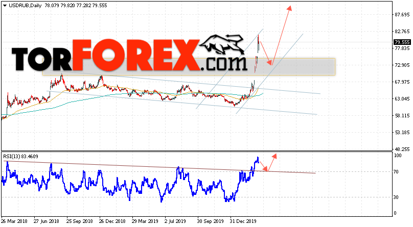 Валютная пара Доллар Рубль USD/RUB завершает торговую неделю вблизи уровня 79.55 Рублей за Доллар США. Пара продолжает движение в рамках сильного роста. Скользящие средние указывают на наличие бычьей тенденции. Цены ушли далеко от области между сигнальными линиями, что указывает а давление со стороны покупателей доллара США. На текущей торговой неделе 23 — 27 марта 2020 стоит ожидать попытку развития коррекции и тест области поддержки вблизи уровня 72.85. Откуда стоит ожидать отскок и продолжение роста курса Доллара выше уровня 88.05.