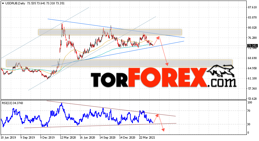 Валютная пара Доллар Рубль USD/RUB завершает торговую неделю вблизи уровня 73.35 Рублей за Доллар США. Пара продолжает движение в рамках коррекции и формирования большой модели ”Треугольник”. Скользящие средние указывают на наличие бычьей тенденции. Однако цены пробили область между сигнальными линиями вниз, что указывает на давление со стороны продавцов доллара США. На текущей торговой неделе 24 — 28 мая 2021 стоит ожидать попытку развития роста и тест области сопротивления вблизи уровня 76.25. Откуда стоит ожидать отскок и начала падения курса Доллара к Российскому Рублю ниже уровня 65.05.