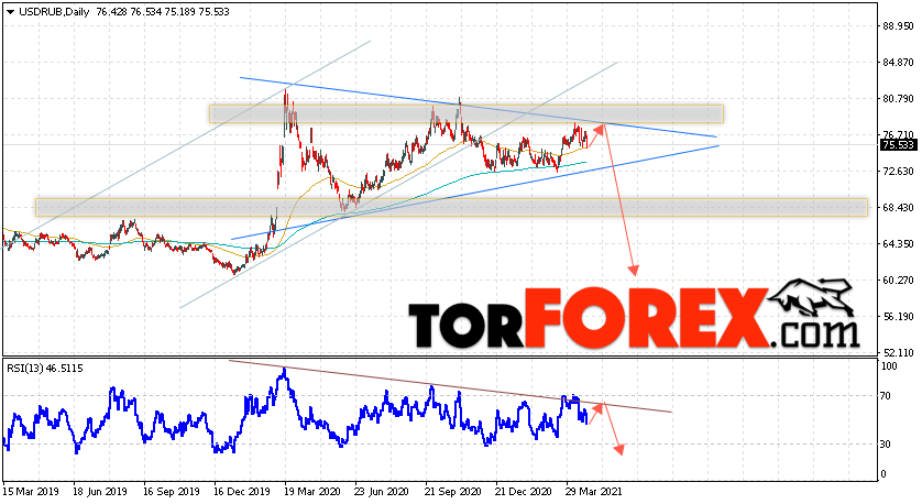 Таким образом, Прогноз курса Доллара на неделю 26 — 30 апреля 2021 предполагает попытку теста области сопротивления вблизи уровня 76.85. Откуда стоит ожидать попытку падения цены и курса Доллара в область ниже уровня 66.35. Дополнительным сигналом в пользу такого варианта станет отскок от линии сопротивления на индикаторе относительной силы. Отменой варианта снижения курса Доллара на текущей торговой неделе станет сильный рост и пробой области 80.05. Что укажет на продолжение подъёма пары с целью на уровне 85.45.