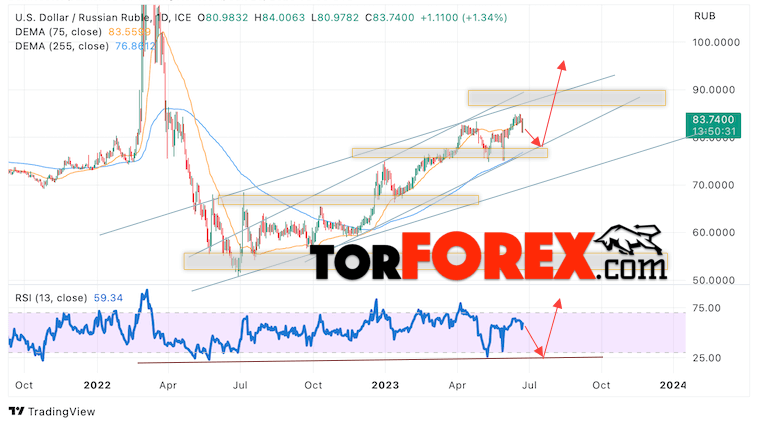 Валютная пара Доллар Рубль USD/RUB завершает торговую неделю вблизи уровня 83.74 Рублей за Доллар США. Пара продолжает движение в рамках роста и бычьего канала. Скользящие средние указывают на наличие бычьей тенденции. Цены вновь тестируют область между сигнальными линиями, что указывает на давление со стороны покупателей доллара США и вероятное продолжение роста пары уже с этих уровней. На текущей торговой неделе 26 — 30 июня 2023 стоит ожидать попытку развития коррекции и тест области поддержки вблизи уровня 81.65. Откуда стоит ожидать отскок вверх и продолжение роста курса Доллара к Российскому Рублю с целью выше уровня 96.05.
