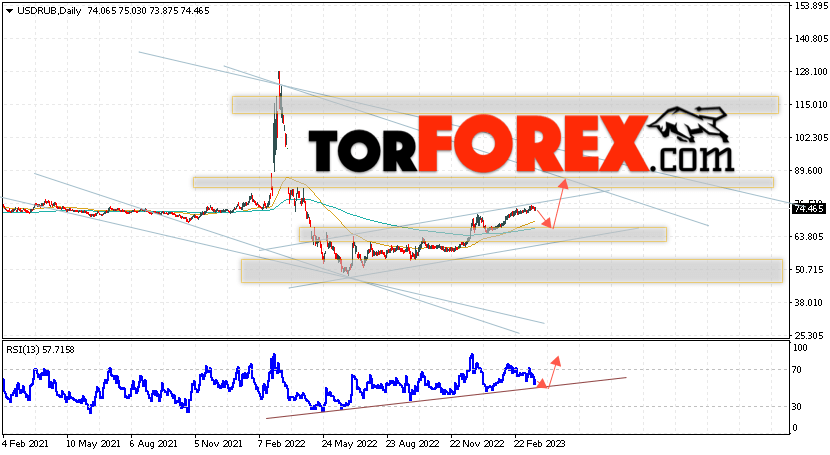 Валютная пара Доллар Рубль USD/RUB завершает торговую неделю вблизи уровня 74.46 Рублей за Доллар США. Пара продолжает движение в рамках роста и бычьего канала. Скользящие средние указывают на наличие бычьей тенденции. Цены пробили область между сигнальными линиями вверх, что указывает на давление со стороны покупателей доллара США и вероятное продолжение роста пары уже с этих уровней. На текущей торговой неделе 27 — 31 марта 2023 стоит ожидать попытку развития снижения и тест области поддержки вблизи уровня 68.95. Откуда стоит ожидать отскок вверх и продолжение роста курса Доллара к Российскому Рублю с целью выше уровня 87.55.