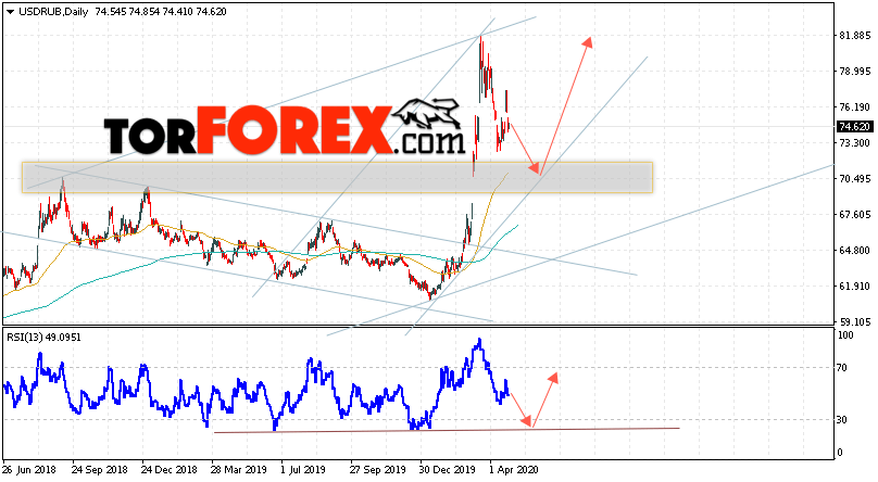 Валютная пара Доллар Рубль USD/RUB завершает торговую неделю вблизи уровня 74.62 Рублей за Доллар США. Пара продолжает движение в рамках коррекции и восходящего канала. Скользящие средние указывают на наличие бычьей тенденции. Цены ушли далеко от области между сигнальными линиями, что указывает на давление со стороны покупателей доллара США. На текущей торговой неделе 27 апреля — 1 мая 2020 стоит ожидать попытку развития падения и тест области поддержки вблизи уровня 70.50. Откуда стоит ожидать отскок и продолжение роста курса Доллара к Российскому Рублю выше уровня 81.85.