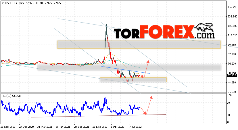 Валютная пара Доллар Рубль USD/RUB завершает торговую неделю вблизи уровня 57.97 Рублей за Доллар США. Пара продолжает движение в рамках коррекции и формирования модели ”Голова и плечи”. Скользящие средние указывают на наличие медвежьей тенденции. Цены пробили вниз область между сигнальными линиями, что указывает на давление со стороны продавцов доллара США и вероятное продолжение падения пары уже с этих уровней. На текущей торговой неделе 29 августа — 2 сентября 2022 стоит ожидать попытку развития снижения и тест области поддержки вблизи уровня 55.25. Откуда стоит ожидать отскок вверх и продолжение роста курса Доллара к Российскому Рублю с целью выше уровня 75.05.