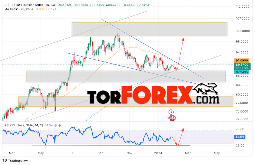 Валютная пара Доллар Рубль USD/RUB завершает торговую неделю вблизи уровня 91.09 Рублей за Доллар США. Пара продолжает движение в рамках падения и завершения формирования разворотной модели «Клин». Скользящие средние указывают на наличие восходящей тенденции. Цены вновь тестируют область между сигнальными линиями, что указывает на давление со стороны покупателей доллара США и вероятное продолжение роста пары уже с этих уровней. На текущей торговой неделе 29 января — 2 февраля 2024 стоит ожидать попытку развития коррекции и тест области поддержки вблизи уровня 87.75. Откуда стоит ожидать отскок вверх и продолжение роста курса Доллара к Российскому Рублю с целью выше уровня 98.65.