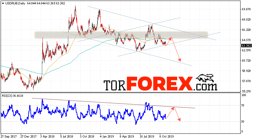 Валютная пара Доллар Рубль USD/RUB завершает торговую неделю вблизи уровня 63.38 Рублей за Доллар США. Пара продолжает движение в рамках коррекции и нисходящего канала. Скользящие средние указывают на наличие нисходящей тенденции. На текущей торговой неделе 4 — 8 ноября 2019 стоит ожидать попытку роста и тест области сопротивления вблизи уровня 64.55. Откуда стоит ожидать отскок и продолжение падения курса Доллара ниже уровня 60.65.