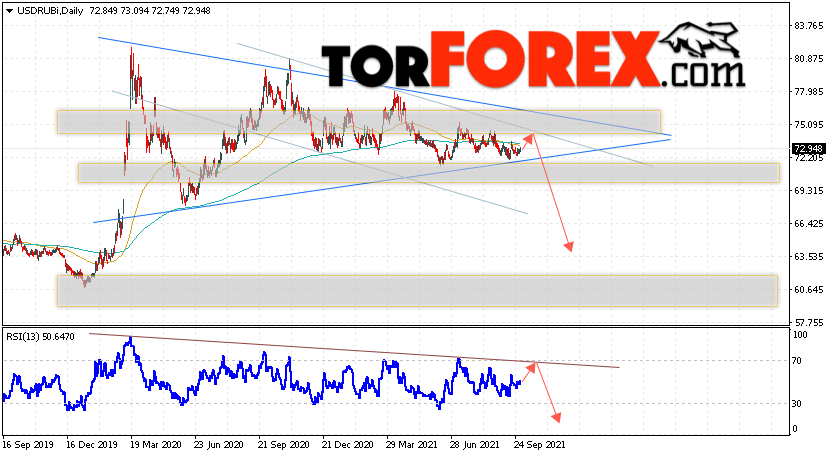 Валютная пара Доллар Рубль USD/RUB завершает торговую неделю вблизи уровня 72.94 Рублей за Доллар США. Пара продолжает движение в рамках коррекции и формирования модели ”Треугольник”, который участники рынка не могут пробить в одну из сторон. Скользящие средние указывают на наличие нисходящей тенденции. Цены пробили область между сигнальными линиями вниз, что указывает на давление со стороны продавцов доллара США и вероятное продолжение падения пары уже с этих уровней. На текущей торговой неделе 4 — 8 октября 2021 стоит ожидать попытку развития коррекции и тест области сопротивления вблизи уровня 74.65. Откуда стоит ожидать отскок и продолжение падения курса Доллара к Российскому Рублю ниже уровня 63.55.
