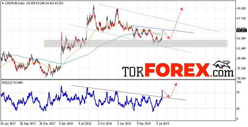 Валютная пара Доллар Рубль USD/RUB завершает торговую неделю вблизи уровня 65.23 Рублей за Доллар США. Пара продолжает движение в рамках коррекции и нисходящего канала. Скользящие средние указывают на наличие медвежьей тенденции. На текущей торговой неделе 5 — 9 августа 2019 стоит ожидать снижения и тест области поддержки вблизи уровня 63.55. Откуда стоит ожидать отскок и продолжение роста курса Доллара выше уровня 69.90.