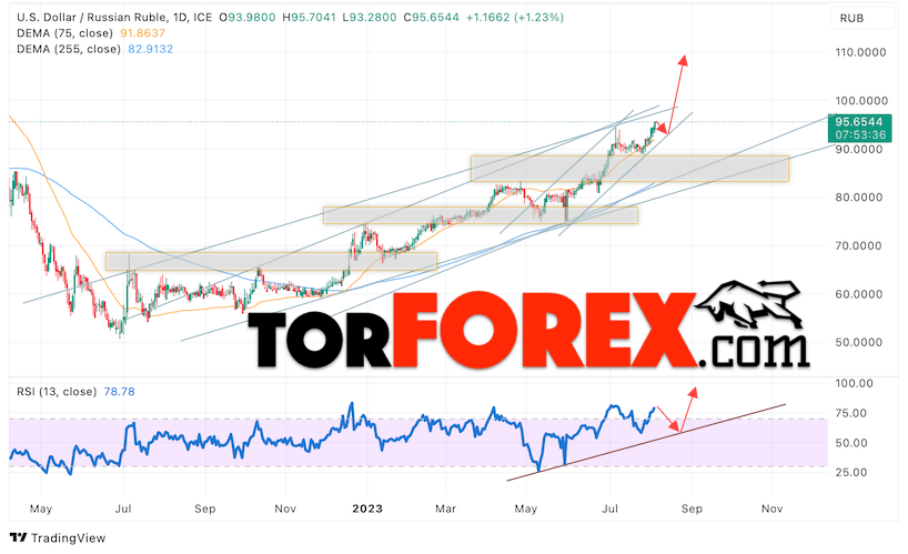 Валютная пара Доллар Рубль USD/RUB завершает торговую неделю вблизи уровня 95.65 Рублей за Доллар США. Пара продолжает движение в рамках подъёма цены и бычьего канала. Скользящие средние указывают на наличие бычьей тенденции. Цены пробили область между сигнальными линиями вверх, что указывает на давление со стороны покупателей доллара США и вероятное продолжение роста пары уже с этих уровней. На текущей торговой неделе 7 — 11 августа 2023 стоит ожидать попытку развития коррекции и тест области поддержки вблизи уровня 93.45. Откуда стоит ожидать отскок вверх и продолжение роста курса Доллара к Российскому Рублю с целью выше уровня 110.65.
