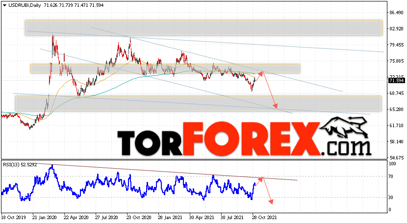 Валютная пара Доллар Рубль USD/RUB завершает торговую неделю вблизи уровня 70.58 Рублей за Доллар США. Пара продолжает движение в рамках коррекции и медвежьего канала. Скользящие средние указывают на наличие нисходящей тенденции. Цены пробили область между сигнальными линиями вниз, что указывает на давление со стороны продавцов доллара США и вероятное продолжение падения пары уже с этих уровней. На текущей торговой неделе 8 — 12 ноября 2021 стоит ожидать попытку развития коррекции и тест области сопротивления вблизи уровня 72.55. Откуда стоит ожидать отскок и продолжение падения курса Доллара к Российскому Рублю ниже уровня 65.35.