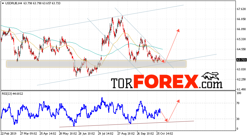В пользу роста пары USD/RUB 1 ноября 2019 выступит тест восходящей линии поддержки на индикаторе относительной силы. Вторым сигналом станет завершение формирования разворотной модели. Отменой варианта роста пары USD/RUB на Форекс станет падение и пробой уровня 62.85 Рублей за Доллар. Это укажет на пробой области поддержки и продолжение снижения пары Доллар Рубль в область ниже уровня 61.15. Подтверждением подъёма пары выступит пробой области сопротивления и закрытие над уровнем 64.85, что укажет на завершение формирования разворотной модели «Двойное Дно».
