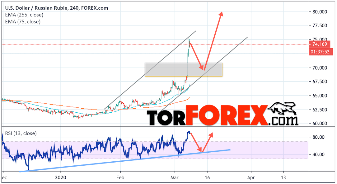 Валютная пара Доллар Рубль USD/RUB продолжает движение в рамках роста и восходящего канала. В момент публикации прогноза курс Доллара США к Российскому Рублю составляет 74.16. Скользящие средние указывают на наличие краткосрочной бычьей тенденции. Цены отталкиваются от области между сигнальными линиями, что указывает на давление со стороны покупателей американской валюты. В рамках прогноза курса USD/RUB на завтра 10 марта 2020 года стоит ожидать попытку развития коррекции и тест уровня поддержки вблизи области 70.05 Рублей за Доллар США. Затем, отскок и продолжение роста валютной пары в область выше уровня 85.00.
